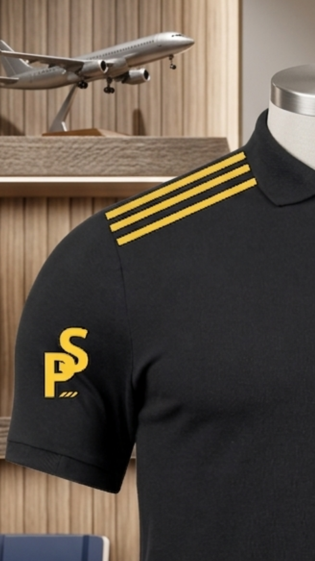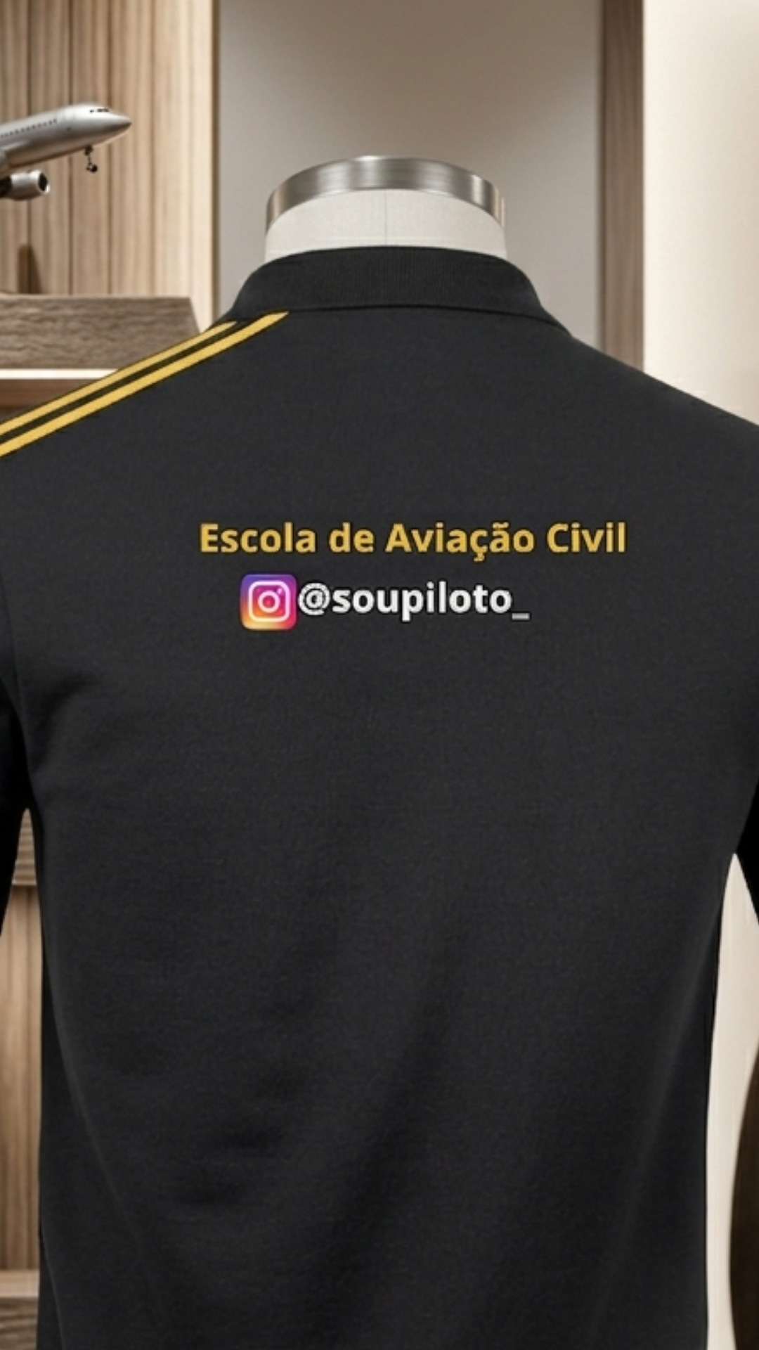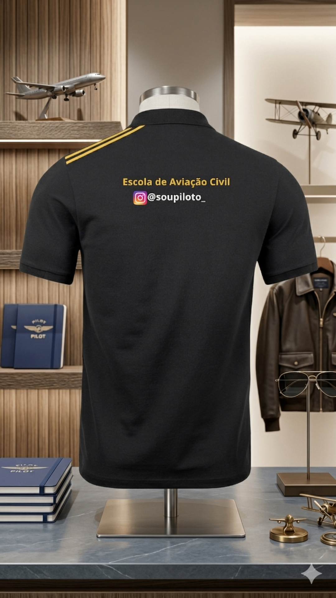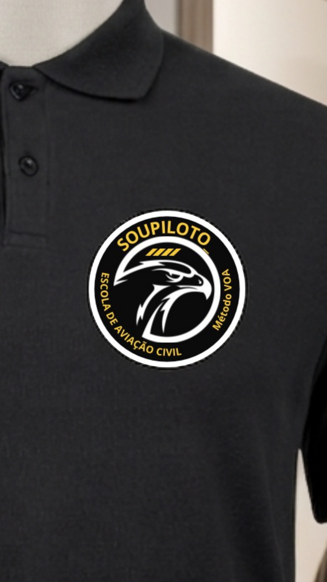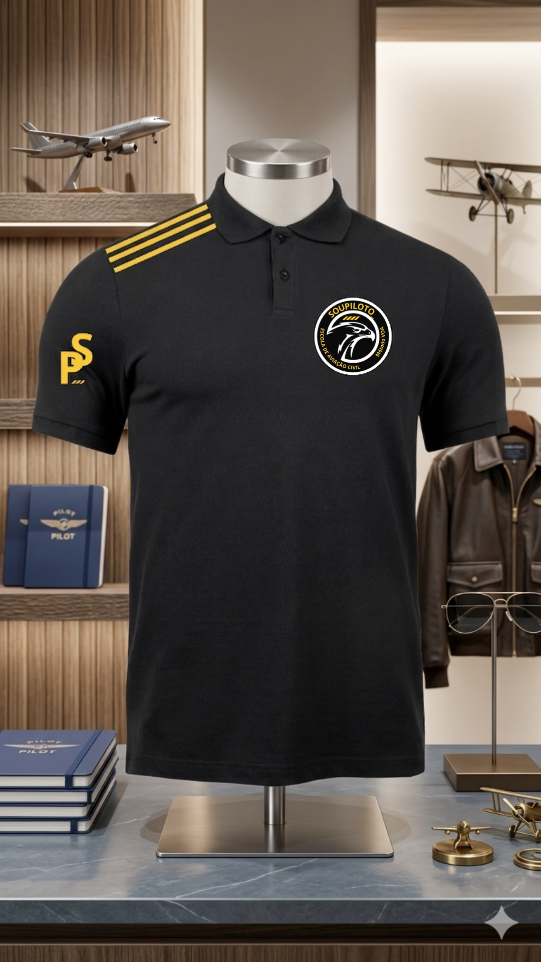 “Cada ponto de bordado é uma rota. Cada divisa, uma hora de voo. Esta polo carrega a identidade de quem decidiu transformar o céu em escritório.”
